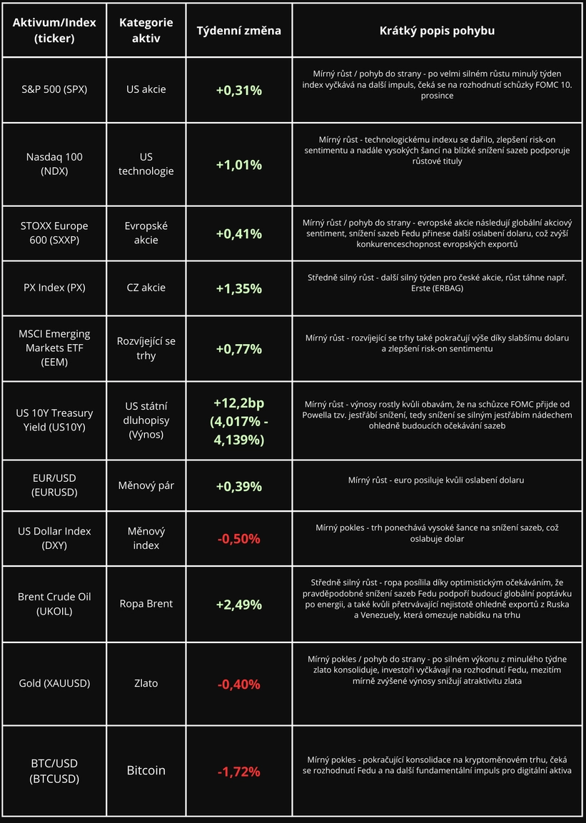 Fed po téměř 4 letech oficiálně ukončil svůj program kvantitativního utahování. Konec tohoto postupného snižování rozvahy, které poslední roky odčerpávalo likviditu z finančního systému, se však pevně očekávalo. Tempo snižování bylo totiž už od jara 2025 velmi mírné (cca 5 miliard dolarů měsíčně) a důsledky pro dostupnou likviditu tedy v praxi minimální. Přestože se tedy nejedná o žádné převratné překvapení, nové ukončení alespoň symbolicky uzavírá celou éru předešlé přísnosti Fedu. Tato změna také znamená, že z trhu přestane mizet i ten poslední zbytek likvidity, takže prostředí bude o něco přívětivější než doposud. Pro akciové trhy to ale zatím nic zásadního nemění - likvidita byla poslední měsíce stabilní a dopad této změny na ocenění aktiv je momentálně jen velmi malý.