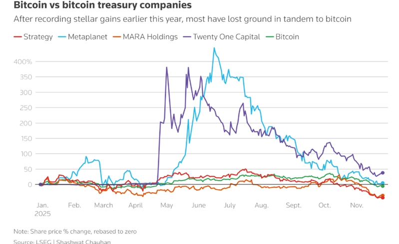 Graf 2: Procentuální vývoj cen akcií firem držících Bitcoin oproti ceně Bitcoinu od začátku roku 2025.