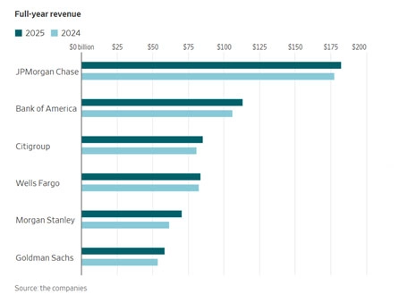 Minulý týden začala výsledková sezóna. Zahájily ji největší americké banky, které zveřejnily hospodářské výsledky za čtvrté čtvrtletí roku 2025. Těchto šest největších bank v roce 2025 společně dosáhlo tržeb přibližně 593 miliard dolarů, což představuje meziroční nárůst o 6 %. Rekordních čísel bylo dosáhnuto díky zvyšujícím se tržbám z úspěšných tradingových divizí, kde například Goldman Sachs (GS) zaznamenal meziroční nárůst o 23 %, Morgan Stanley (MS) o 28 % a JPMorgan (JPM) o 33 %. Celkový zisk těchto šesti bankovních institucí vzrostl meziročně o 8 % na zhruba 157 miliard dolarů.