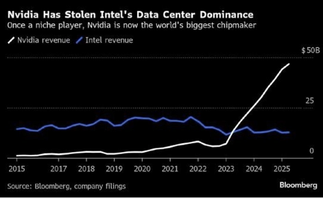 Zdroj grafu: Bloomberg, Intel Soars After Nvidia Makes $5 billion Investment, 18.9.2025