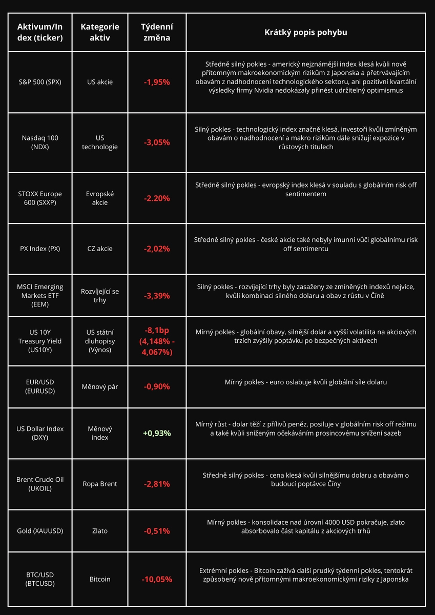 Další proměnnou je kurz japonského jenu, který minulý týden dále oslaboval. USDJPY vzrostl z 154,5 až na 157,9 a už se zase posouvá k magické úrovni 160, kde se japonská vláda v minulosti zavázala k případným intervencím. Prozatím k intervenci nedošlo, ale vláda zpřísnila tón a znovu investory varovala, což alespoň lehce a krátkodobě japonský jen posílilo. Tržní veteráni si totiž jistě jsou vědomi, že byť jsou japonské intervence vzácné, dokážou být velmi agresivní. A případná intervence by nebyla problémem jen pro běžné spekulanty na kurz jenu, ale také pro sofistikovanější tržní účastníky, které využívají tzv. yen carry trade. Jedná se především o velké investiční banky a hedgeové fondy, kteří si po dlouhá léta půjčují japonské jeny prakticky zadarmo, protože domácí sazby v Japonsku byly po většinu období blízko nuly. Tyto levně vypůjčené jeny následně smění za dolary nebo jiné měny a investují je například do státních a firemních dluhopisů, kreditních strategií či do rizikovějších měn. Zjednodušeně se jedná o úrokovou arbitráž, která funguje výborně, dokud je japonský jen slabý a japonské sazby nízké. Jakmile ale jen začne rychle posilovat nebo Japonsko zvýší sazby, náklady na půjčení prudce rostou a fondy jsou nuceny tyto pozice rychle neutralizovat. Problémy s uzavřením těchto pozic se potom přelijí z forexu i do jiných trhů - naposledy například v srpnu 2024, kdy kvůli této panice S&P 500 ztratilo téměř 10 % a NASDAQ téměř 16 %. Právě proto minulý týden indexy všude po světě klesaly, když se investoři a velcí hráči začali nuceně připravovat na podobné potenciální problémy.