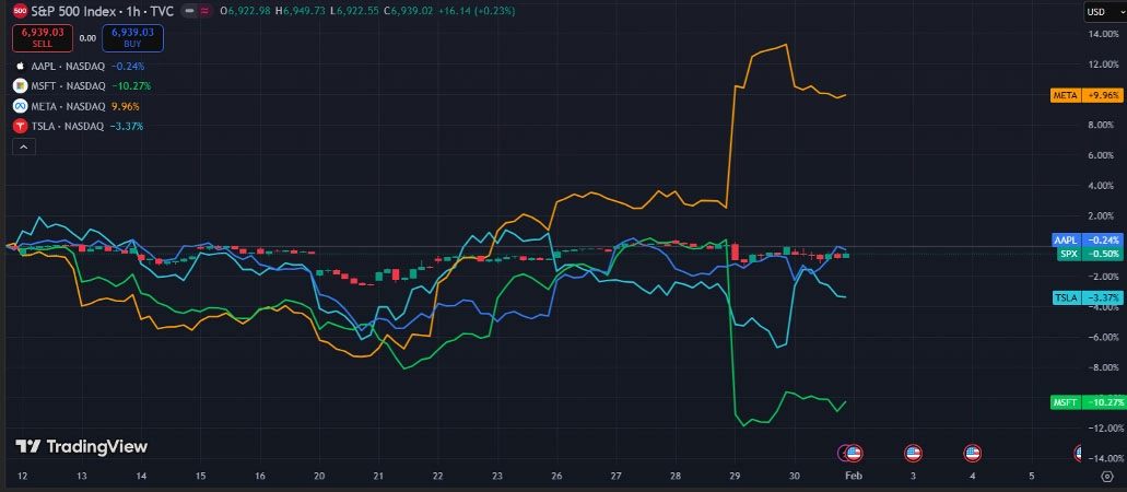 Graf 1: Krátkodobý vývoj cen akcií Meta Platforms, Microsoft, Tesla a Apple ve srovnání s indexem S&P 500. Na grafu je patrná bezprostřední tržní reakce na zveřejnění hospodářských výsledků.