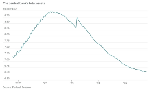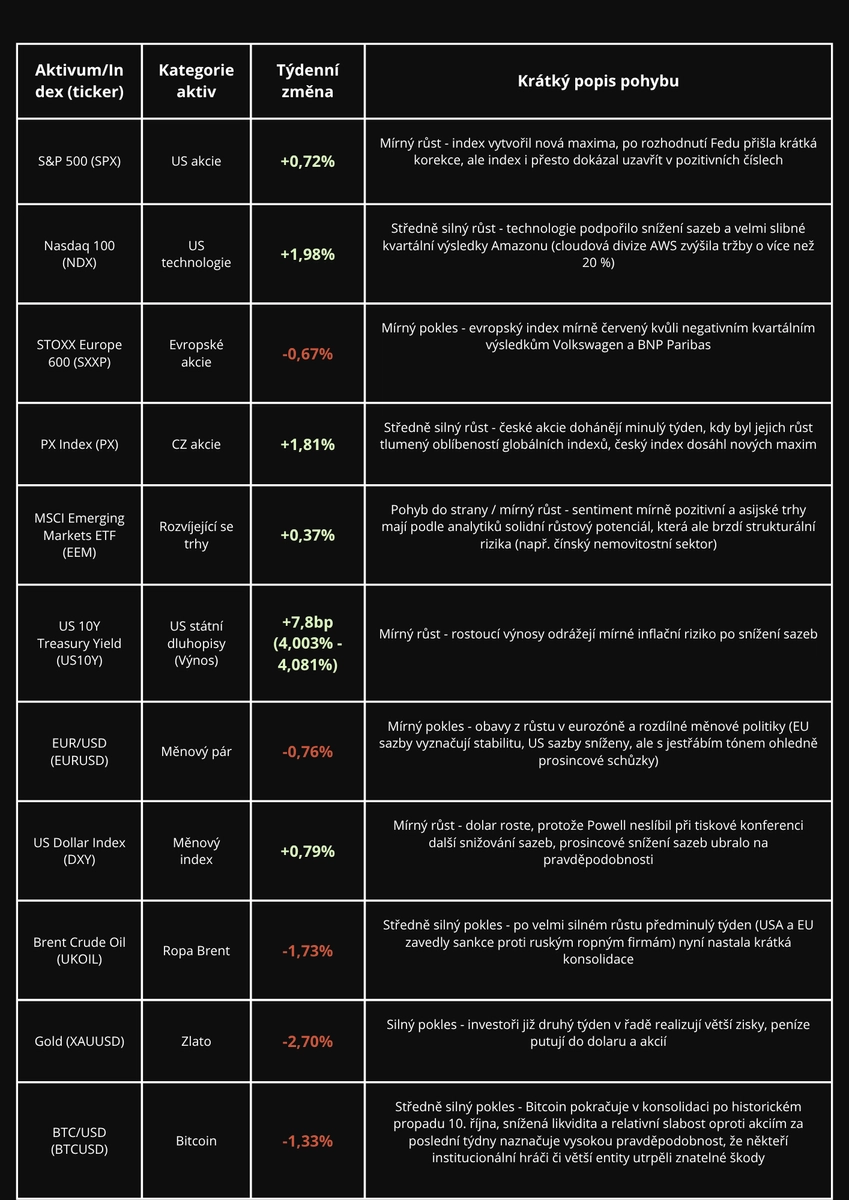 Fed ve středu 29. října podle očekávání trhu znovu snížil sazby o čtvrt procentního bodu do pásma 3,75 až 4,00 %. Zároveň oznámil, že kvantitativní utahování (QT) 1. prosince skončí. Nekoná se ale žádný návrat k nákupům dluhopisů ani začátek nového kvantitativního uvolňování (QE). Od dubna 2022 totiž Fed postupně prodával a neobnovoval splatné státní dluhopisy, čímž z trhu ubíral volnou likviditu. To nyní sice skončí, ale žádné nové peníze do systému aktivně přidávat nebude. Nicméně, výnosy z dozrávajících dluhopisů tedy bude Fed reinvestovat do krátkodobých pokladničních poukázek (T-bills), aby potenciálním problémům na krátkodobých trzích předešel.
