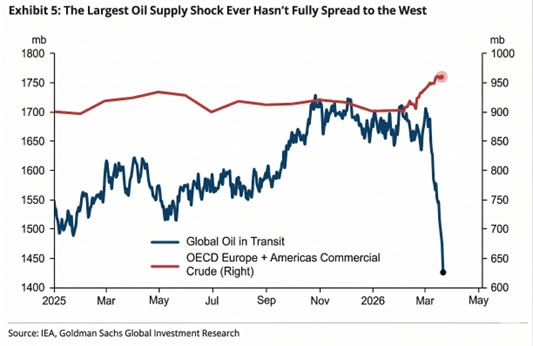 Napětí dál zůstávalo soustředěné hlavně kolem Hormuzského průlivu, jehož provoz se sice částečně obnovuje, k běžnému fungování má ale stále daleko. Během týdne byl potvrzen průjezd několika ománských, francouzských a japonských lodí, později průlivem prošel také malajsijský tanker s iráckou ropou. Část lodí už skutečně prochází průlivem, ale nejde o návrat k normálnímu provozu. Právě s tím souvisí i přiložený graf, kde podle Goldman Sachs objem ropy v tranzitu během krátké doby prudce klesl z 1,7 miliardy barelů na přibližně 1,42 miliardy. Komerční zásoby v Evropě a Americe zatím tak silný dopad neodrážejí, takže část šoku se do západních trhů může promítnout až později. Vedle toho se objevily informace, že Teherán připravuje nový právní rámec, který má do budoucna upravit podmínky plavby přes průliv.