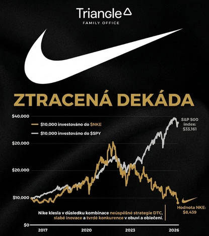 Firma Nike (NKE) ve výsledcích za třetí fiskální čtvrtletí 2026 mírně překonala očekávání, přestože tržby ve výši 11,28 miliardy dolarů oproti předchozímu čtvrtletí klesly o 9,1 % a meziročně v podstatě stagnovaly. Trh ale zklamal hlavně slabý výhled na další měsíce, protože analytici ještě před zveřejněním výsledků počítali pro aktuální čtvrtletí s růstem tržeb o 1,9 %. Nike však ve svém výhledu uvedla, že naopak očekává jejich pokles o 2 až 4 %, přičemž samotná Čína má oslabit zhruba o 20 %. Právě na to akcie reagovaly prudkým poklesem a den uzavřely se ztrátou přes 15 % na nejnižší úrovni od října 2014. Nike na čínském trhu naráží na kombinaci slabší produktové nabídky, ztráty podílu ve prospěch domácích značek jako Anta a Li Ning a nutnosti dál rozprodávat starší zásoby. Slabost je vidět i u značky Converse, která spadá pod Nike a v posledním čtvrtletí zaznamenala propad tržeb o 35 % napříč všemi regiony. Jak zároveň ukazuje graf níže, nejde jen o jedno slabší čtvrtletí, ale o delší období výrazného zaostávání akcií Nike za širším americkým akciovým trhem. Od vrcholu z roku 2021 přitom akcie Nike ztratily více než 70 %, což dobře ukazuje hloubku zhoršení investorského pohledu na firmu. Management pod vedením Elliotta Hilla dál sází na běh, inovace a návrat ke sportovnímu jádru značky, viditelnější přínos změn ale může přijít až v roce 2027.