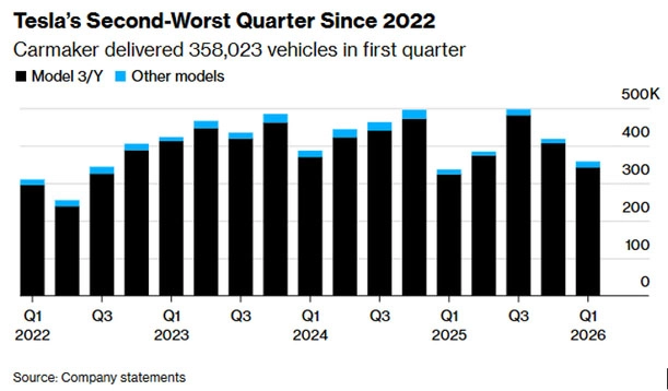 Zdroje: Reuters, Tesla deliveries mark weakest quarter in a year, inventory swells, 2.4.2026; The Wall Street Journal, Rising Tesla Sales in First Quarter Didn't Beat Wall Street Expectations, 2.4.2026; Barron’s, Tesla Stock Drops on Deliveries. What Wall Street Is Saying., 3.4.2026