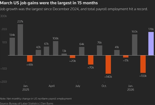Další zdroje: The Wall Street Journal, Hiring Defied Expectations in March, With 178,000 New Jobs, 3.4.2026; Barron’s, Employers Added 178K Jobs, 3.4.2026