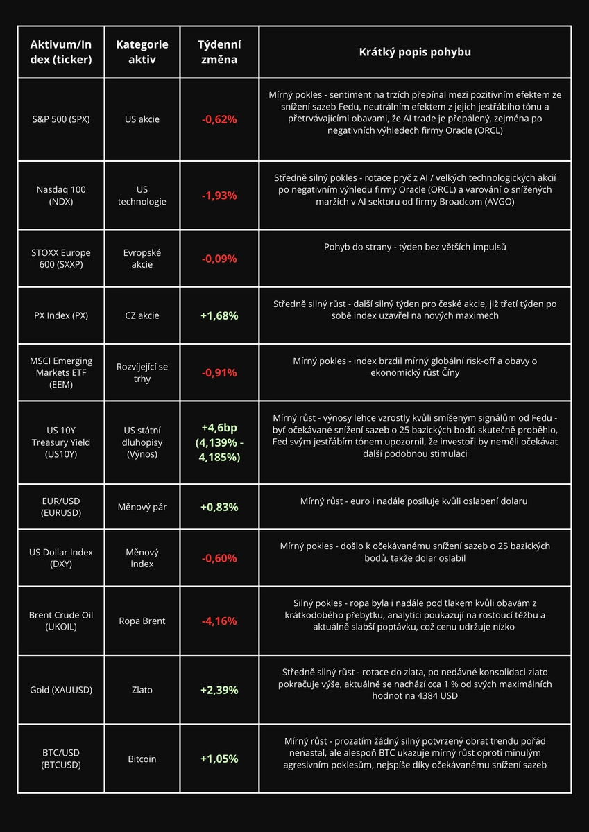 Zdroje: Barrons, Review & Preview: It’s a Cut, 10.12.2025; The Wall Street Journal, Fed Cuts Rates Again, Signals It May Be Done for Now, 10.12.2025; Reuters, Fed signals pause on rate cuts as investors navigate data darkness and leadership change, 11.12.2025
