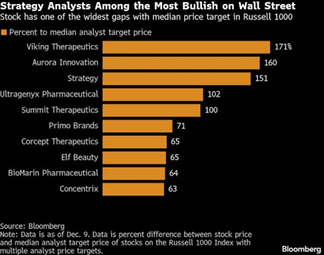 Akcie Strategy spadly od svého vrcholu v listopadu minulého roku o více než 70 %, Bitcoin si poslední týdny prošel hlubokou korekcí a získat nový kapitál je dnes mnohem obtížnější, než v éře nulových sazeb. Navzdory tomuto komplikovanému tržnímu prostředí pro firmu Strategy (MSTR) se většina analytiků na Wall Street nevzdává své investiční teze a očekává brzké zotavení. Přiložený graf z Bloombergu ukazuje, že Strategy má podle nich třetí nejvyšší odhadovaný růstový potenciál v celém indexu Russell 1000. Medián cenových odhadů u tohoto temperamentního titulu počítá se zhodnocením 151 % během následujících dvanácti měsíců. Tento optimismus nejspíše počítá s tím, že po ustálené a únavné konsolidaci jsou historicky pohyby Bitcoinu mimo range a zpět nahoru velmi agresivní a podobné rychlé zhodnocení znovu nafoukne hodnotu jejich rezerv, a tím pádem i aktuální férovou tržní cenu akcií Strategy. Z jejich výhledu lze také usoudit, že navzdory aktuálnímu poklesu je Strategy stále považována za nejprémiovější veřejně obchodovatelnou proxy na Bitcoin, i když se letos ukázalo, jakou oboustrannou mincí tato strategie může být. V minulé analýze jsme sdíleli novinky, že firma musela vytvořit dolarovou rezervu v hodnotě 1,44 miliardy dolarů, aby zvládla vyplácení dividend, úroků na dluh a provozní výdaje bez nutnosti prodávat své Bitcoiny v nevhodnou chvíli. Právě tyto obavy ale analytiky příliš netrápí, protože většina doporučení se stále pohybuje v pásmu nákupu (nejvyšší cenové cíle počítají s 200 - 300 % zhodnocením).